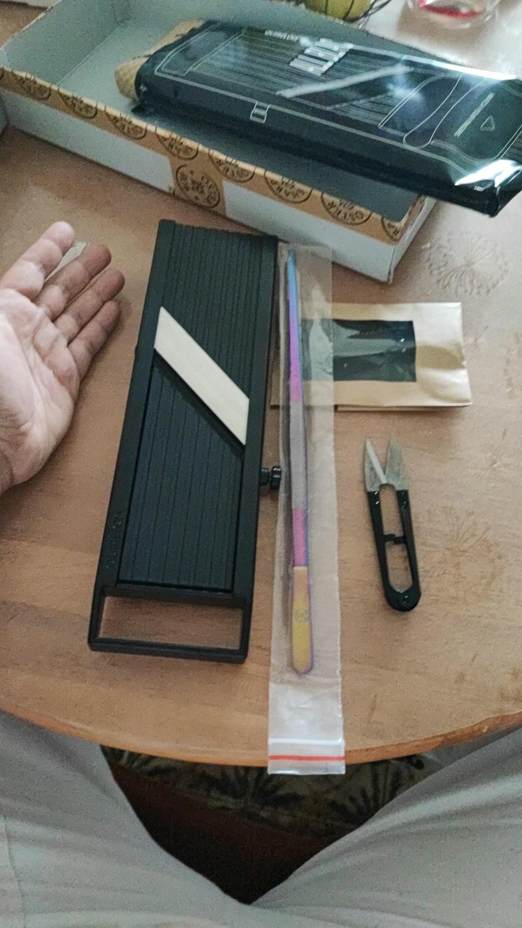 Materijal: Nehrđajući čelik (oštrice, vijak), ABS plastika (okvir mandoline, kućište priloženih oštrica, nastavak za debljinu), PS (držač za rezanje), mesing (matica za umetnuti)